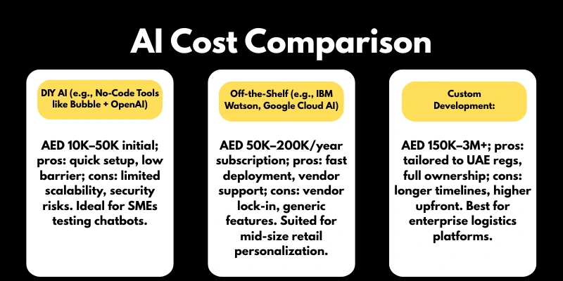 Budget Recommendations: SMEs: AED 120K–550K; Mid-size: AED 500K–1.6M; Enterprises: AED 2M+. MVPs and open-source tools can reduce costs by 25–40%, achieving ROI in 3–12 months.
